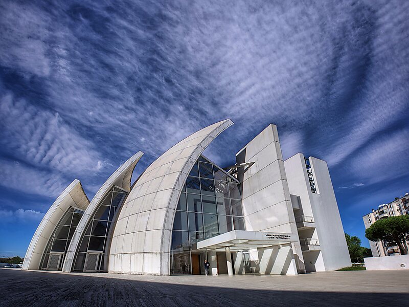 1. Diseño Moderno: La iglesia se caracteriza por su diseño minimalista y moderno. Richard Meier, el arquitecto detrás de este proyecto, es conocido por su enfoque en el uso de la luz natural y el juego de volúmenes y geometría en sus diseños.